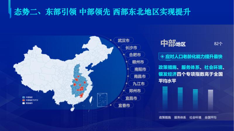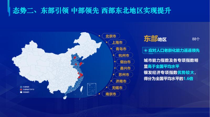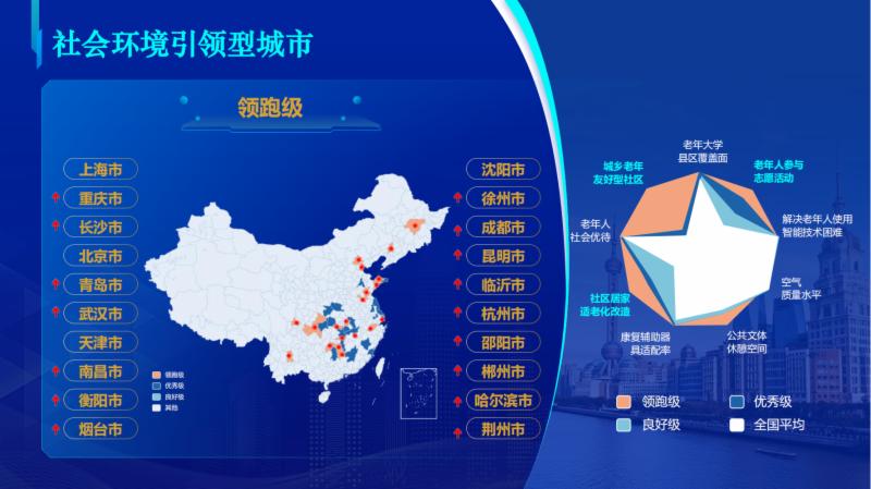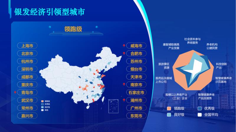 根据报告,在政策措施支持度方面,北京市、枣庄市、济宁市、赣州市、九江市等城市处于全国领先水平;在财富储备充足度方面,北京市、上海市、深圳市、杭州市、无锡市等城市处于全国领先水平;在服务体系完善度方面,青岛市、唐山市、烟台市、重庆市、济南市等城市处于全国领先水平;在社会环境友好度方面,上海市、重庆市、长沙市、北京市、青岛市等城市处于全国领先水平;在银发经济成长度方面,上海市、北京市、杭州市、深圳市、成都市等城市处于全国领先水平。