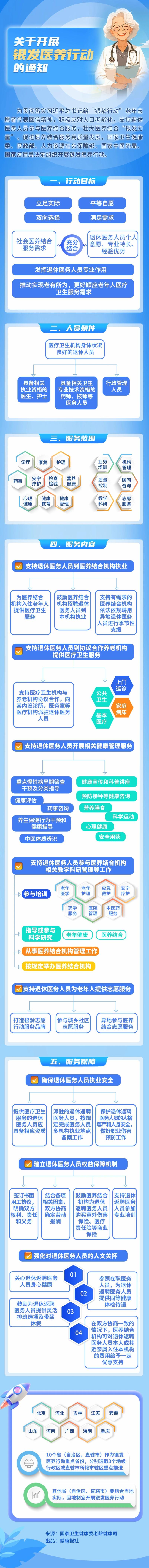 为贯彻落实习近平总书记给“银龄行动”老年志愿者代表回信精神,积极应对人口老龄化,支持退休医务人员参与医养结合服务,壮大医养结合“银发力量”,促进医养结合服务高质量发展,国家卫生健康委、民政部、人力资源社会保障部、国家中医药局、国家疾控局决定组织开展银发医养行动。现就有关事项通知如下: