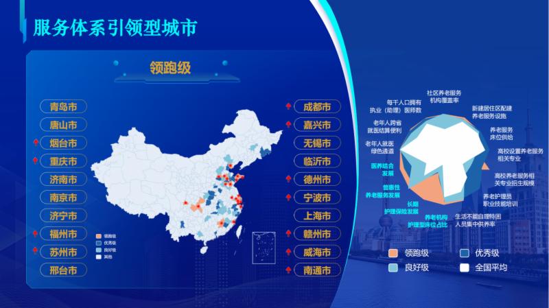 根据报告,在政策措施支持度方面,北京市、枣庄市、济宁市、赣州市、九江市等城市处于全国领先水平;在财富储备充足度方面,北京市、上海市、深圳市、杭州市、无锡市等城市处于全国领先水平;在服务体系完善度方面,青岛市、唐山市、烟台市、重庆市、济南市等城市处于全国领先水平;在社会环境友好度方面,上海市、重庆市、长沙市、北京市、青岛市等城市处于全国领先水平;在银发经济成长度方面,上海市、北京市、杭州市、深圳市、成都市等城市处于全国领先水平。
