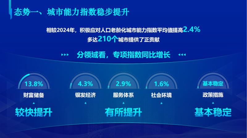 这是国家信息中心连续第四年发布该项研究成果。报告从政策措施支持度、财富储备充足度、服务体系完善度、社会环境友好度、银发经济成长度等5个维度,采用49个具体指标对我国337个地级及以上城市积极应对人口老龄化能力进行了定量评价。结果显示,城市能力指数平均值稳步提升,同比增长2.4%。分领域看,财富储备指数较快提升,银发经济、服务体系、社会环境指数有所提升,政策措施指数基本稳定。北京市、上海市、青岛市、成都市、重庆市、杭州市、烟台市、武汉市、嘉兴市、苏州市等城市积极应对人口老龄化能力指数处于全国领先水平。