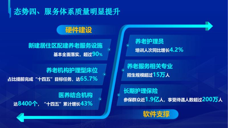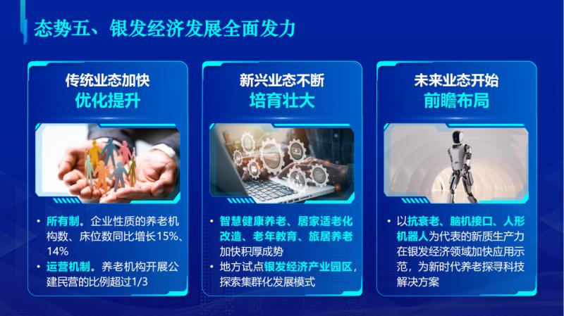 报告指出,城市能力指数呈现出东部引领、中部领先,西部、东北地区持续提升的区域格局。老年人急难愁盼需求更好满足,跨省直接结算医疗机构数快速铺开,老年助餐点几乎从无到有。服务体系质量明显提升,养老机构护理型床位占比达到65.7%、超额完成“十四五”规划目标任务,养老服务相关专业招生规模持续增加。银发经济发展全面发力,养老机构等传统业态加快优化提升,智慧健康养老、居家适老化改造等新兴业态不断培育壮大,抗衰老、脑机接口、人形机器人等未来业态加快应用示范。